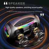 Experience powerful, immersive sound on the go with this Portable Bluetooth Speaker. This speaker delivers an impressive 60W output (2 x 30W drivers) with high-fidelity diaphragms for pure, rich sound quality across a wide sound field. Featuring dual 78mm high-elasticity diaphragms, it ensures instant response and captures every detail of your music, from deep, robust lows to clear, bright highs. Equipped with Bluetooth 5.3 for stable connectivity up to 10 meters, and boasting a 7.4V 2600mAh high-efficiency battery system for 2-10 hours of playtime. It offers versatile playback options including TF card, U disk (USB), AUX input, and wireless Bluetooth. Enjoy dynamic RGB lighting effects that can be switched or turned off, and customizable EQ sound effects for indoor and outdoor listening. Its portable design includes a comfortable carrying handle, durable mesh fabric, anti-slip feet, and attachment points for an optional shoulder strap, making it your perfect audio companion for any occasion.